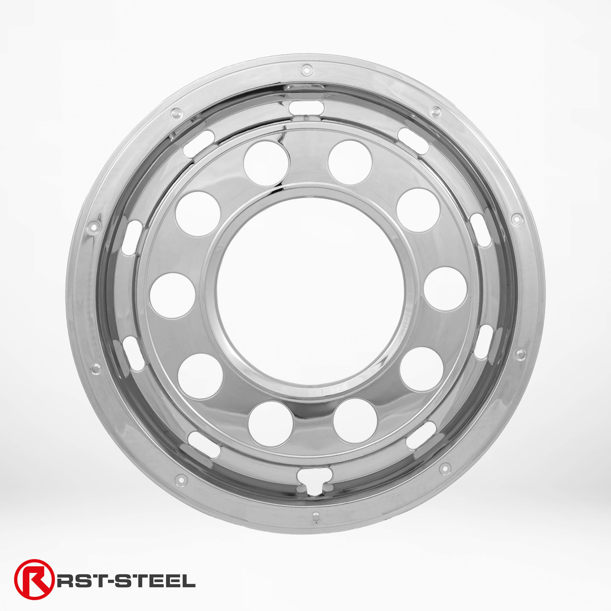 A pair of wheel covers made of stainless steel with an open center for 22.5" rims