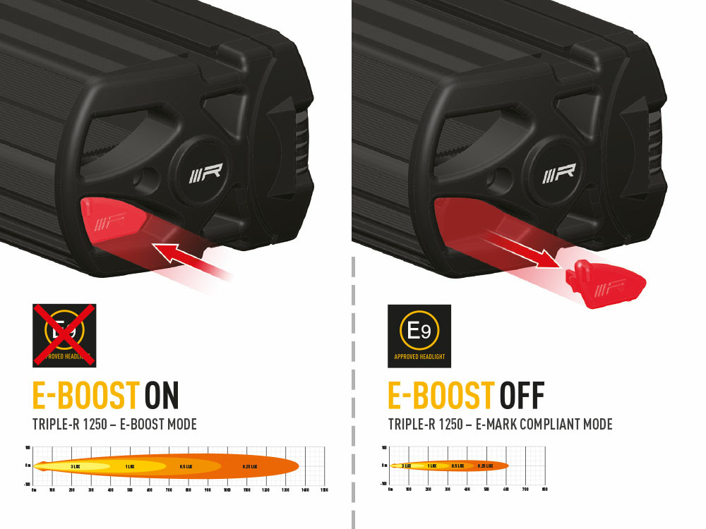 UNECE Reg 112 Class B Driving Light, approved for on-road high beam (E-Boost technology) and Reg 7 position/side light function (white only)